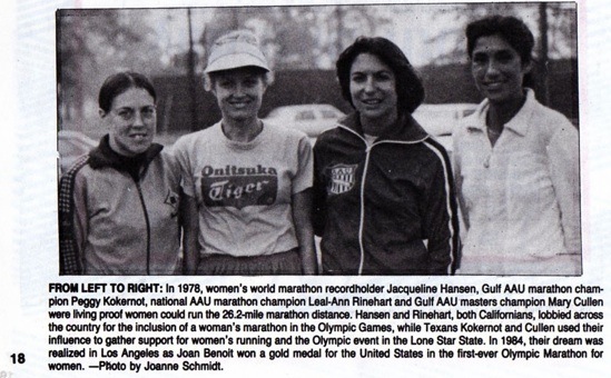 “I was sent to Houston to organize the last week, where I met Jacqueline Hansen and Leal-Ann Reinhart (Jacqueline was the former world record holder in the marathon and Leal-Ann the 1977 U.S. marathon champion), who were there to lobby for the inclusion of a women’s marathon in the Olympics,” recounted Gabeau.