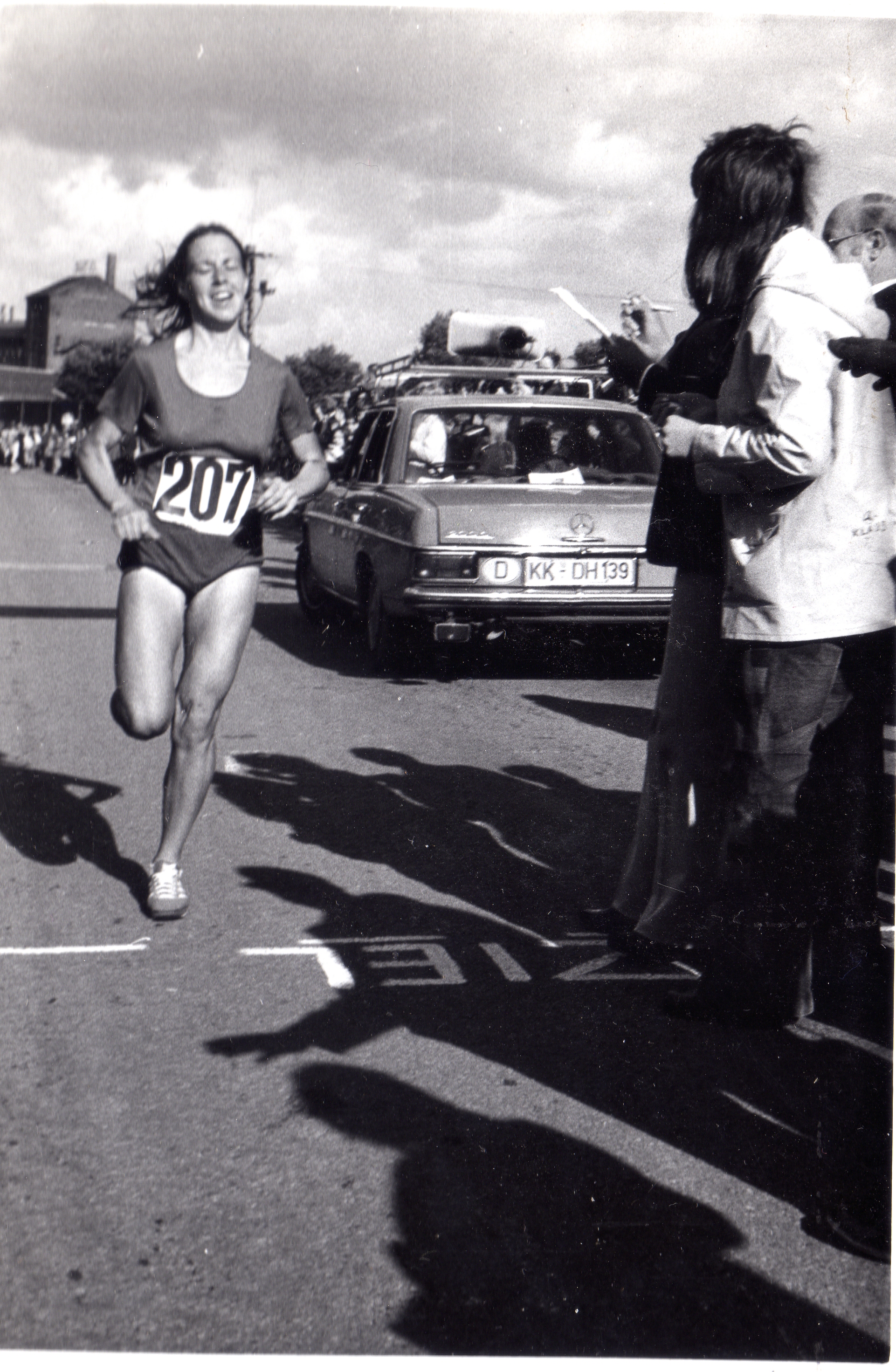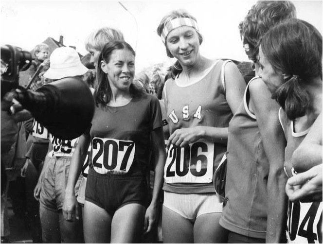 As an early advocate of woman distance runners, Dr. Ernest Van Aaken hosted this first women’s international marathon. He had been arguing the case for women since the fifties, when he fought for a German national championships in 800-meters in 1954, and doubting journalists accused him of creating “Zatopeks in pigtails,” recommending ambulances and stretchers on hand for the finish. That particular reporter did an “about-face” speaking of the “beauty and grace of the winner flying easily across the finish line” (in Dr. Van Aaken’s words). It took him another 15 years to implement the women’s 1500m in the German federation program. In 1973, he held his country’s first women’s marathon. He writes extensively about women, the “enduring sex,” in his book the Van Aaken Method, a translation published by Runners World in 1976, for which my husband wrote the introduction, and included pictures of Joan Ullyot and I with Dr. Van Aaken. Joan wrote about him in Runners’ World magazine articles and in her 1976 book, Women’s Running.