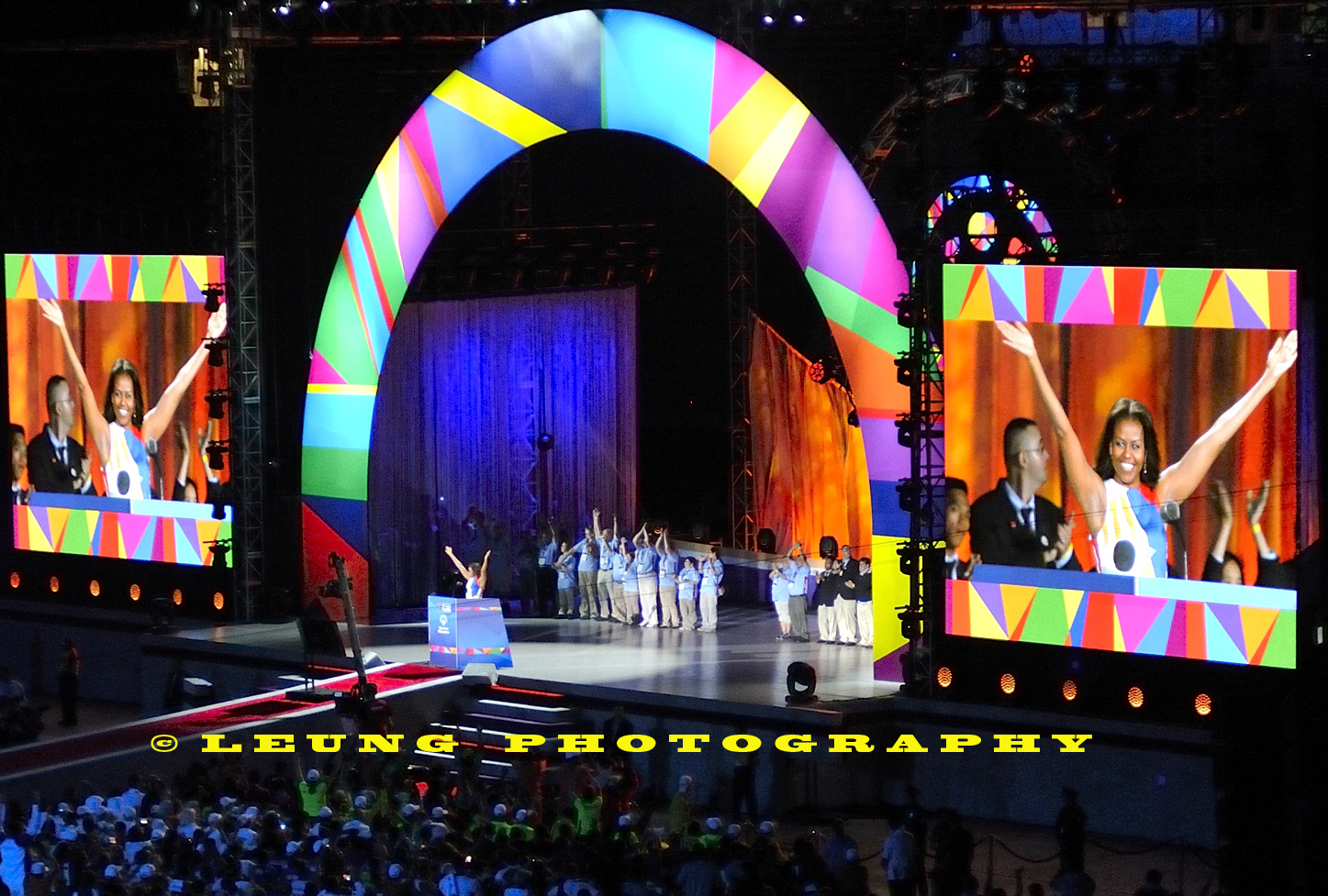 Finally, President Obama greeted the athletes via the “big screen,” and Michelle Obama herself greeted the athletes with motivational words, and declared “Let the Games begin!”