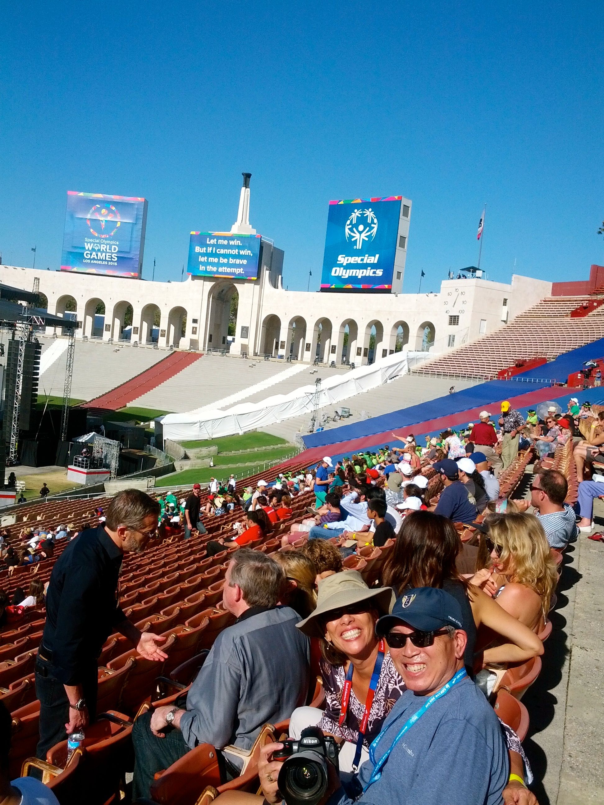 In what became the largest event in town since the LA 1984 Olympic Games, the Special Olympics of 2015 spanned nine days, hosting 177 countries, consisting of 7,000 athletes and 3,000 coaches in 25 sports. Athletes were housed in 100 “host towns” across the Southland. It took 30,000 volunteers to cover events at 27 different venues with 500,000 spectators cheering the athletes on. At the site of both the 1932 and 1984 Olympic Games in the LA Coliseum, the opening ceremonies lit up the skies. LA Times writer Bill Plaschke described it as “Out of this World,” and indeed it was a magical night! Or, as one young athlete Plaschke quoted stated it, “This is the most amazing place, a place we don’t always find in the rest of our world. This is a place where we are all equal.” (I am tearing up. Again.)
