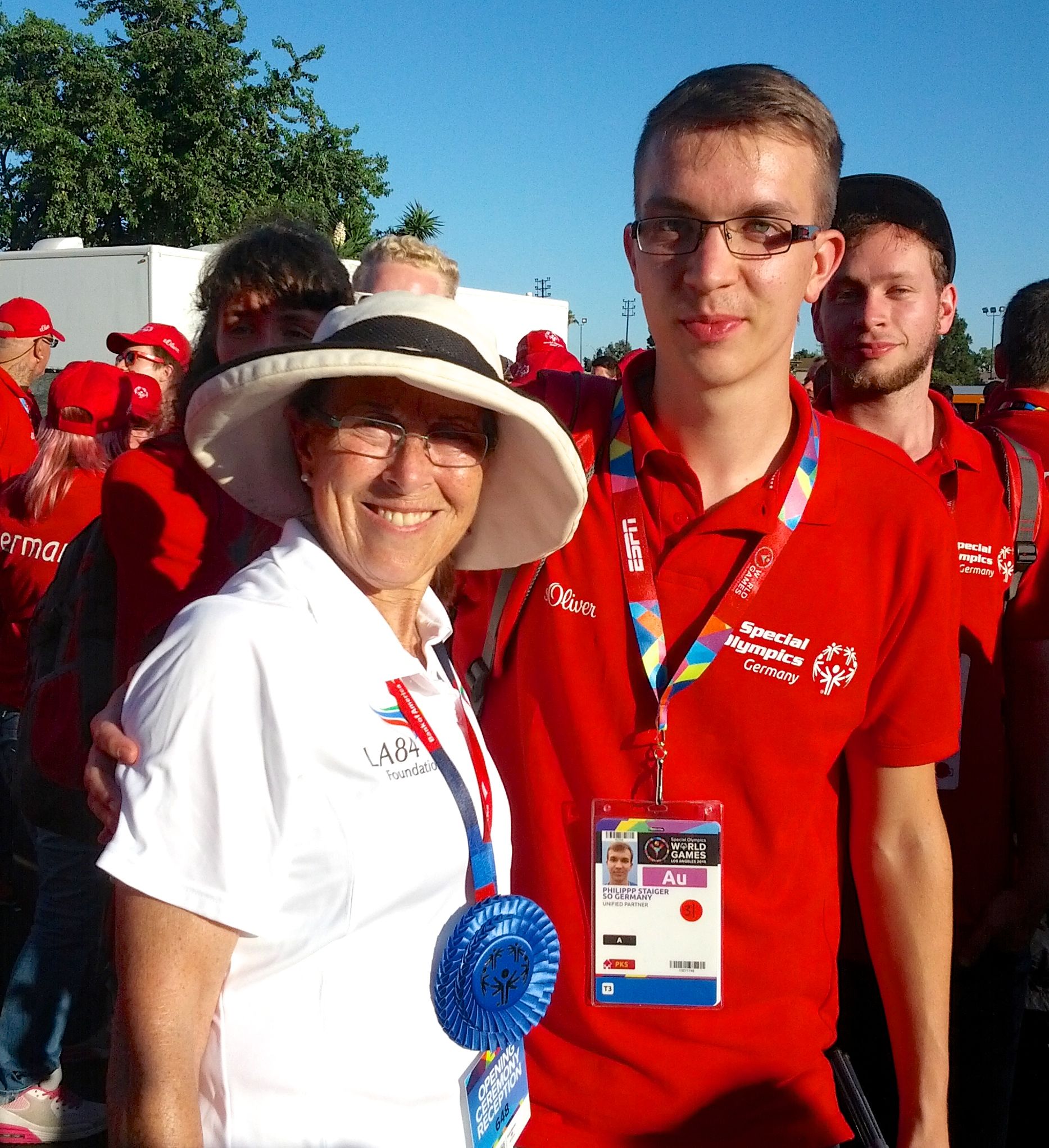 Marching into the stadium, among a sea of red uniforms, I was a speck of all-white-uniform on the floor of the Coliseum which made it easy to spot me for my friends, Jeaney Garcia and Bill Leung, after all. Jeaney, a natural born cheerleader, was also easy to spot doing jumping jacks in the grandstands. The German team – and I – were singing and cheering at the top of our lungs all the way into the tunnels of the stadium where the sound reverberated. Once every team was seated, the star-studded performances followed one another all night long. Inspirational speeches were delivered by celebrities, sponsors, SO Officials and from the keepers-of -the-flame since Eunice Kennedy Shriver originally founded the Games.