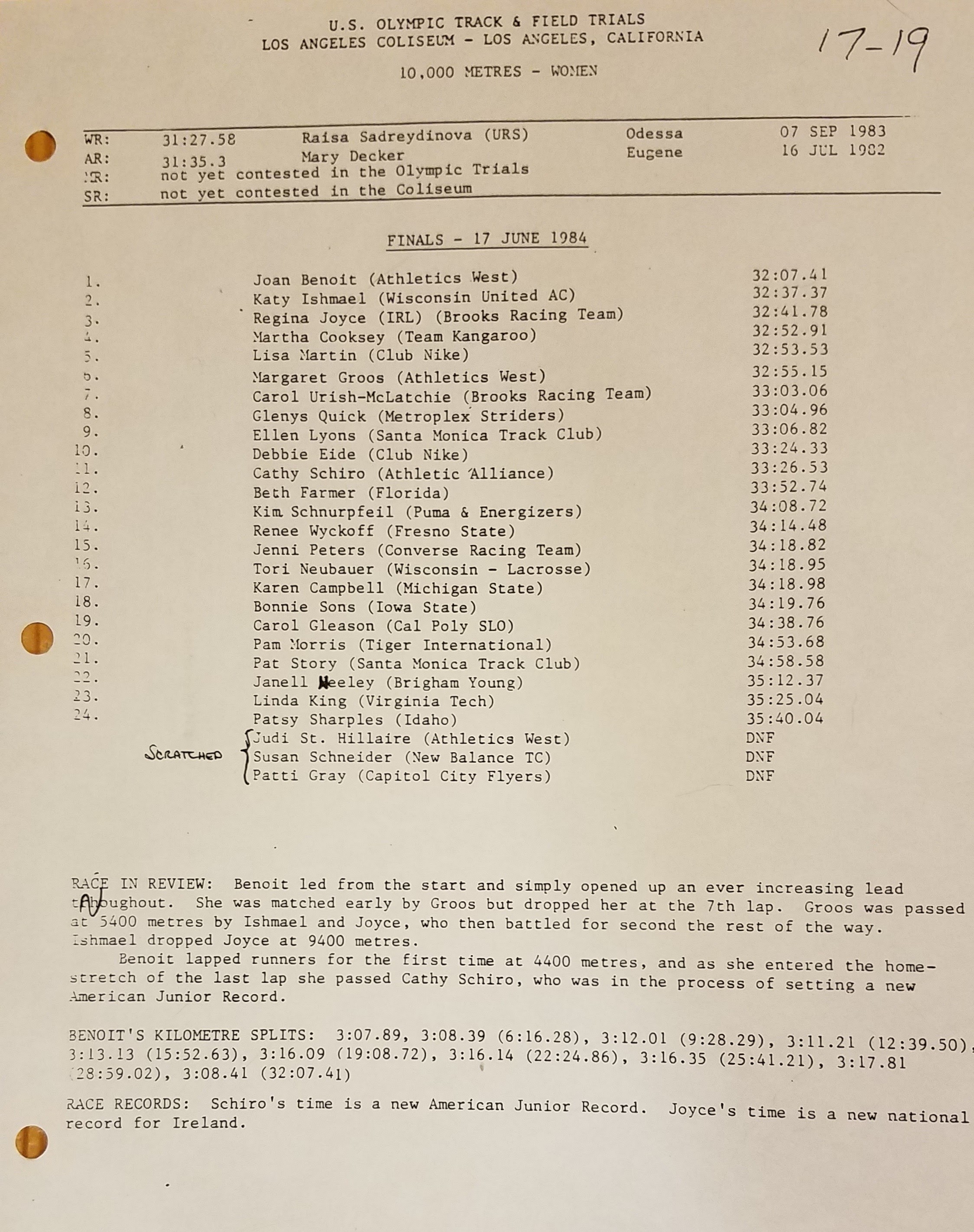 It’s been thirty-three years since Joan Benoit won the first women’s Olympic Marathon, in 1984 at the Los Angeles Coliseum. But how many of you remember (or even knew) that Joan also won the women’s 10,000-meter race, at the USA Track & Field Olympic Trials on June 17, 1984, also in the Coliseum? Wait! Track and Field fans might recall, oh yes, there were no Olympic berths for the 10,000m for women, and not for the women’s 5,000m either. Right. In an act of civil disobedience, if you will, we held an exhibition 5,000m and 10,000m race to point out the glaring omission of these women’s events, with stellar fields of women more than worthy of an Olympic stage. Sad but true, this was the third set of exhibition events since women had been waiting that long (1976, 1980 and 1984 Trials held exhibition races).