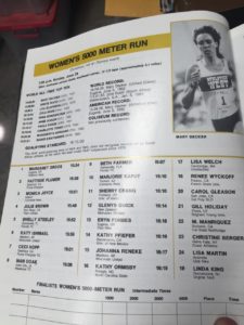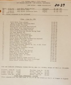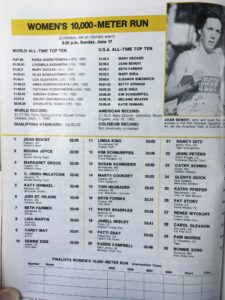 I think it’s quite fitting to re-visit the International Runners Committee’s efforts, advocating for women’s distance events, including an international class action lawsuit. Amidst all the litigation, we have Joan Benoit’s stunning performance in the 10,000m with the fastest American time of the year, coming off her miraculous win at the Olympic Marathon Trials just days after knee surgery. She said the 10,000m was the indicator she needed to tune-up for the Olympic Marathon. June 17th will be the 33rd anniversary of her Exhibition Race win, and how timely, on June 21st she will be honored with the unveiling of a plaque mounted on the walls of the Coliseum to commemorate her Olympic win and the legacy she has left in her wake. Indeed, her legacy continues to grow today.