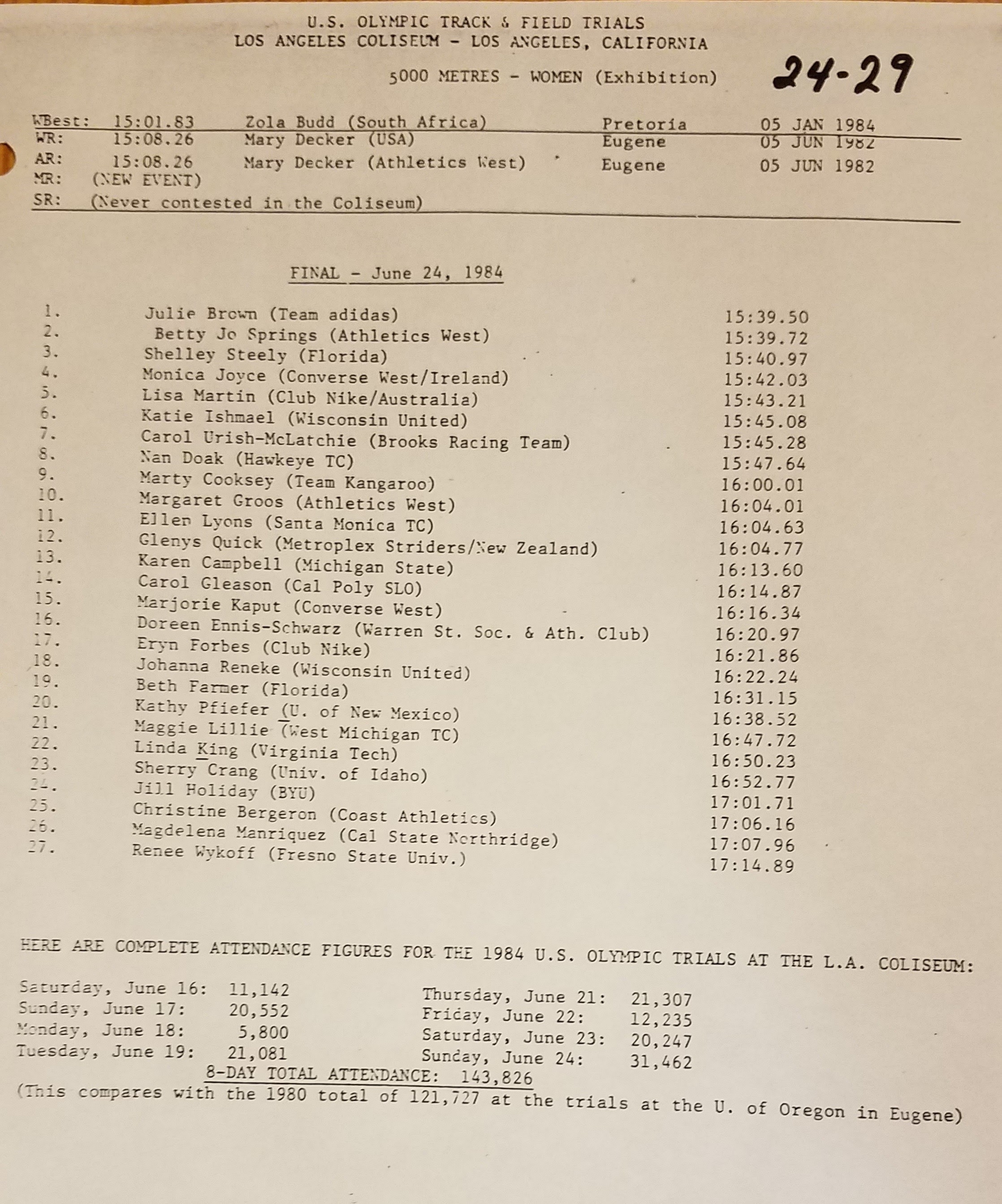 Both races brought exciting performances. On June 17, Joan Benoit (Samuelson) was the decisive winner in the 10,000, finishing in the nation’s fastest time to date (32:07) in front of 20,500 fans. The 5000 on June 24 was decided at the tape between Julie Brown (15:39.5) and Betty Jo Springs (15:39.7) before a crowd of 31,500, the largest audience of the entire trials.
