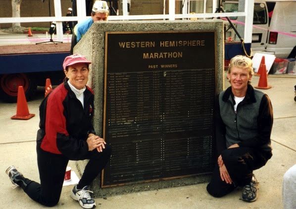 Culver City became my “home course.” The marathon was officially titled Western Hemisphere Marathon (WHM), which we affectionately referred to as the Culver City marathon. It was my first-ever road race/marathon. It was the scene of my first-ever marathon World Record. On the monument which remains at the start/finish line at Overland Ave. & Culver Blvd., the winners’ names are inscribed and I have three titles. I ran it more times than I can remember, whether in training or pacing a friend for their first race. Long ago, the marathon faded away, but the monument remains. Here is Cheryl (Bridges) Treworgy, the first WR on that course and my inspiration to ever run the marathon. Her record in 1971 was as the first woman to ever break 2:50. Later, when I claimed my second WR, I became the first woman to break 2:40 (altho’ on a different course). Still, I have my teammate and lifelong dear friend, Cheryl to thank for inspiration.