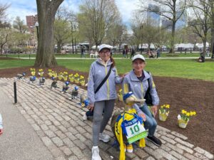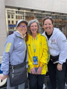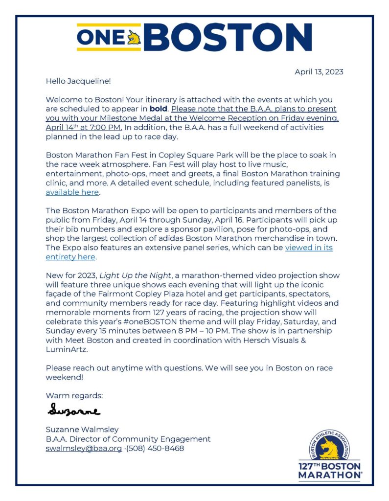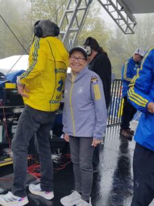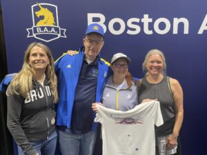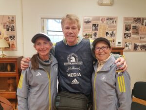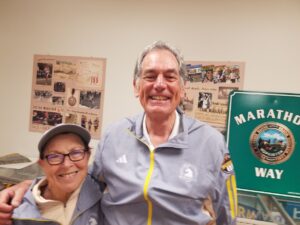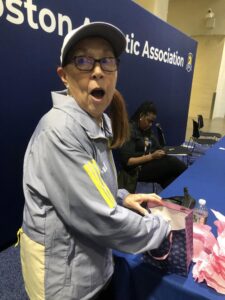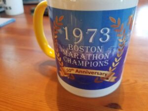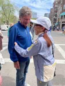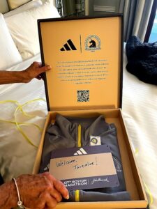 SUNDAY 4/16: A very early morning breakfast took place at the BAA Office with Jack Fleming, Joan Samuelson, and a visiting Chinese tour group. I surprised Jack by presenting my donation to the archives, which are now aptly named after the deceased Gloria Ratti, former VP at the BAA, and long-time advocate for women athletes. She long ago wrangled my winning shirt from me for her collection, and I have her letters to prove it. She had the most beautiful penmanship you could imagine, and she wrote ” . . . persistance paid off . . . thank you for your shirt . . . I knew you’d find it for me . . . ”