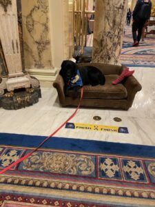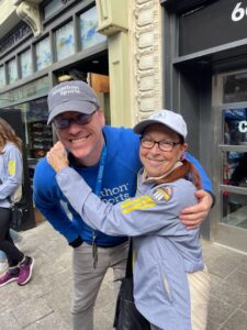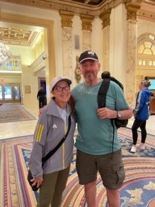 Eventually, the moment that Jon and I had long waited for! Time to go on stage to shoot the starting gun, Jon for the elite men, then me for the elite women. I’m hesitant to share this part of my story, but it turned out fine, so I will reveal what happened. About a month before this trip, my right shoulder — which has two prior reconstruction surgeries and holds 8 screws + 4 anchors already — well, it decided to fall apart again. It is scheduled for replacement surgery in the very near future. As if that weren’t enough to make me wonder how I was going to raise that arm to shoot that gun, then, the night before the trip, I managed to trip myself on the steps up to my house. But instead of going to seek medical help, I just caught my ride and headed for the airport. I did not even want to know the damage. Long story short, while I was seated in the BAA house, waiting to go on stage, I found out the man seated next to me was a physical therapist, and he suggested I hold the gun with both hands. Brilliant! Then, when I got up on stage, the man who taught me to use the gun concurred, and used a practice gun to test out our procedure. Honestly, if you watch the video (a kind woman on stage volunteered to take), it all went smoothly. I was relaxed enough to even blow my friend a kiss on the starting line for the elite women, Natasha Bliss, when we made eye contact (I dared not put that gun down to wave). I felt great relief.