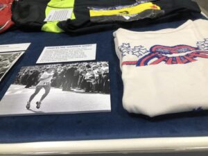 Once out in Hopkinton, after what seemed like a never-ending drive (as I’m sure every runner sees it), we were free to roam about the “village,” but mostly we chose to roam the BAA house located right behind the grandstands overlooking the starting line. The house naturally has a lot of artifacts in glass cases or frames on the wall. I gave Adrianne, Jon, Lorie, and Julie a little tour. I believe this was their first visit to the house.