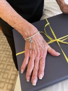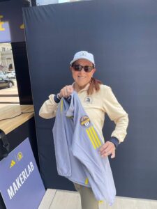 Barbara even pulled that story out of me about what I wore when I won Boston, even though I’ve told it a thousand times. The shirt was the only piece of my wardrobe that worked well, but the terrycloth shorts and wool socks were thrown away. I loved my little shirt, soft cotton, embroidered with hearts, stripes and stars all in red, white and blue. It was suitably patriotic for Patriot’s Day. It became my lucky shirt and I wore it so much, it got holes in it, which I covered with more embroidered stars. Imagine my surprise when this day, I was presented with a gift from my friends Caroline Merena and Diane Cavanaugh Nugent who provided me with a perfect replica of my shirt! It is the piece de resistance!