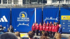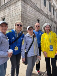 MARATHON MONDAY MORNING 4/17: It was an early wake-up alarm that got us out the door to board the bus at 6:30 AM to go to the starting line in Hopkinton. I saw something in the lobby of the hotel I’d never seen before. As the elite athletes strode through the lobby to board their bus, ahead of us, the hotel staff assembled a sort of tunnel and cheered them on, and of course we all fell into place cheering and applauding. What a spectacle! It was marvelous.