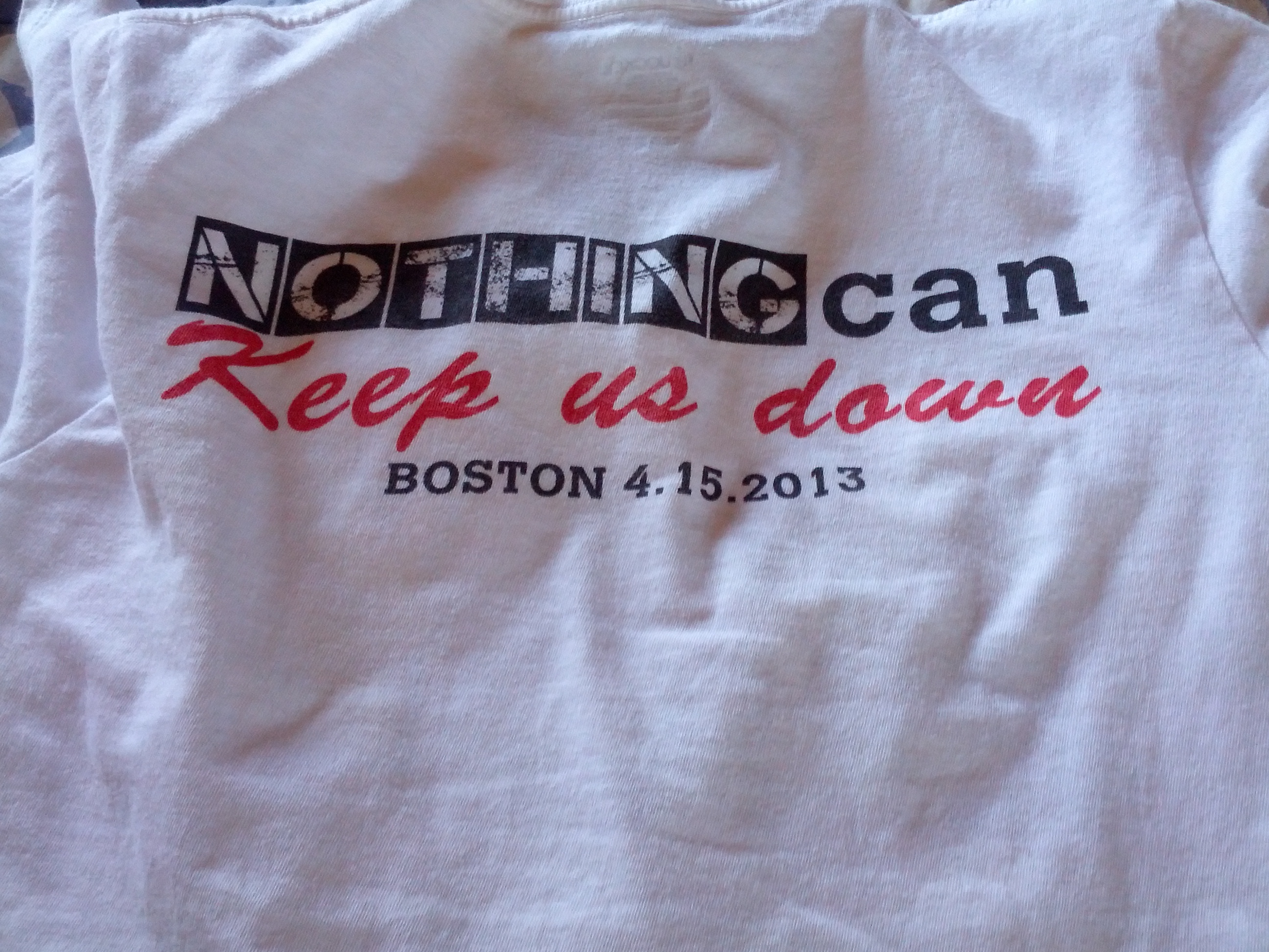 EPIC_shirt_5-12-13May 14th:  New developments continue to surprise.  The group of runners I encountered in Santa Monica soon after my return from Boston got in touch with me and invited me for dinner.  This was the group I saw all wearing “Stay Epic” t-shirts, with “Nothing can keep us down.  Boston 4-15-13” on the back of the shirt.  I now own my own shirt.  And I met the original Epic Man.