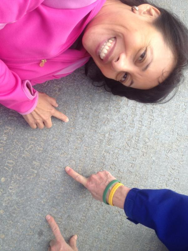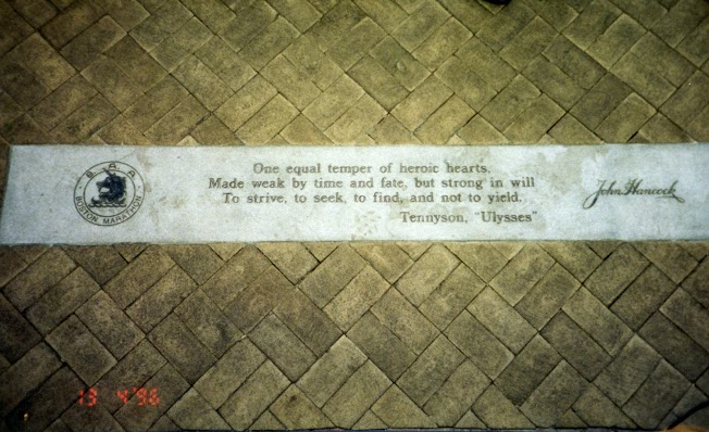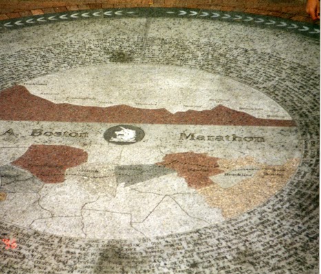 Note: Here is me in 1996, at the 100th Anniversary of the Boston Marathon, examining the newly displayed monument, the “winners’ circle” with my name engraved (which Jeaney is pointing to in the picture above).