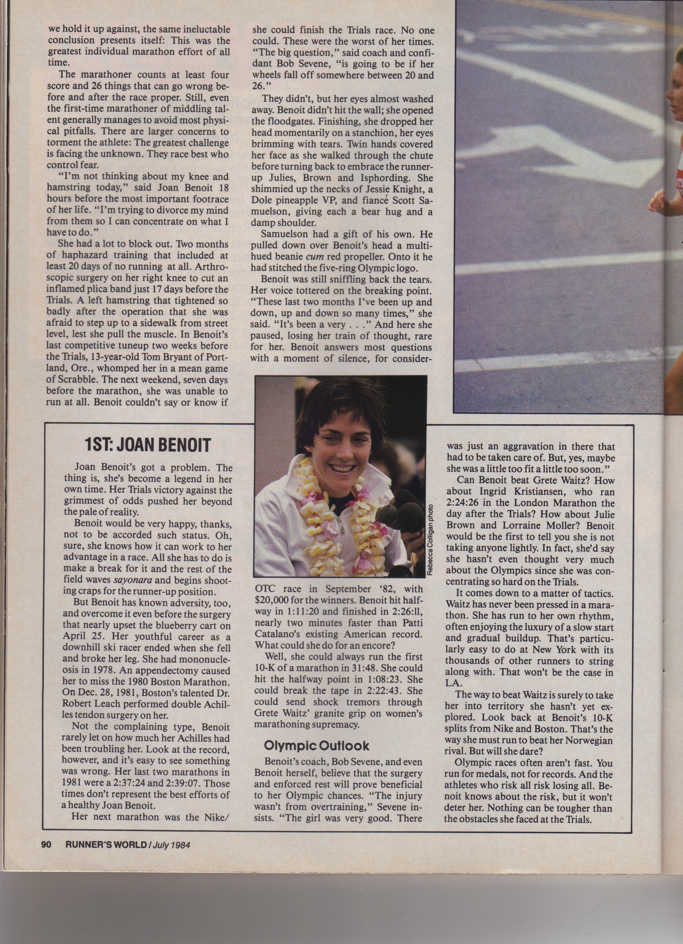 That said, this was the day to celebrate our first-ever USA Olympic Women’s Marathon team. Joan Benoit was the victor. As Amby Burfoot so aptly stated in Runner’s World’s coverage of this race: “No matter from what angle we survey Benoit’s Trials victory in 2:31:04 on May 12 (1984), no matter how dispassionately we attempt to measure her achievement or how many other marathon performances we hold it up against, the same ineluctable conclusion presents itself: The was the greatest individual marathon effort of all time.” Joan had endured a lot in the preceding weeks leading up to the most important race of her life. This included knee surgery, and as if that were not enough, her hamstring muscles tightened up in reaction to the surgery, leaving her with two potential time-bombs that could sideline her at any moment. She prevailed and in world class style. Her new teammates joining that historic team included Julie Brown (2:31:04) and Julie Isphording (2:32:26), who declared, upon finishing, that dreams do come true.