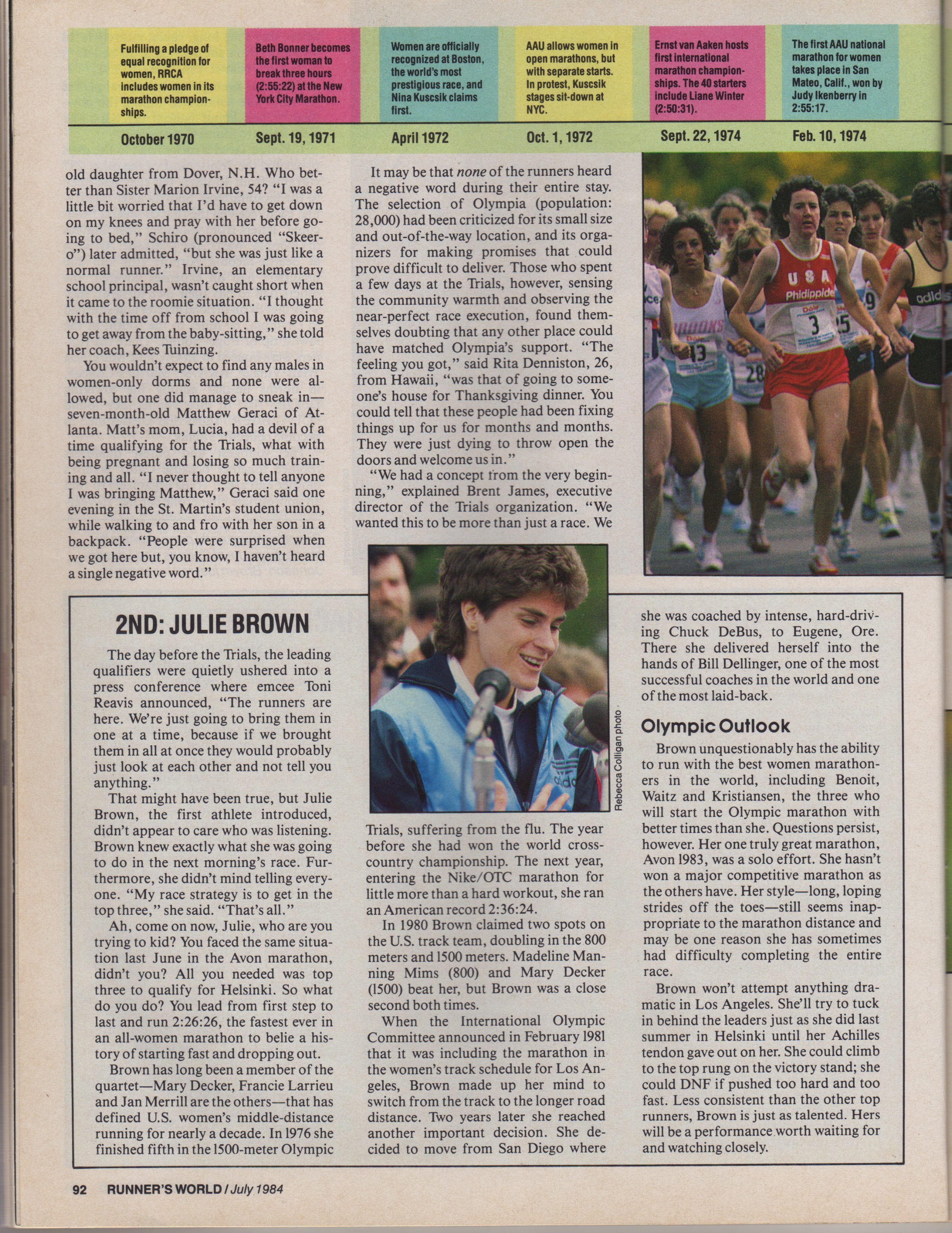 Had the International Runners Committee / American Civil Liberties Union lawsuit for the women’s 5000- and 10,000-meter races been successful and led to inclusion of these events in the 1984 Olympic Games, the makeup and perhaps the outcome of the Olympic Trials marathon might have changed entirely. For that matter, the selection of women’s Olympic marathon teams would have been affected worldwide.
