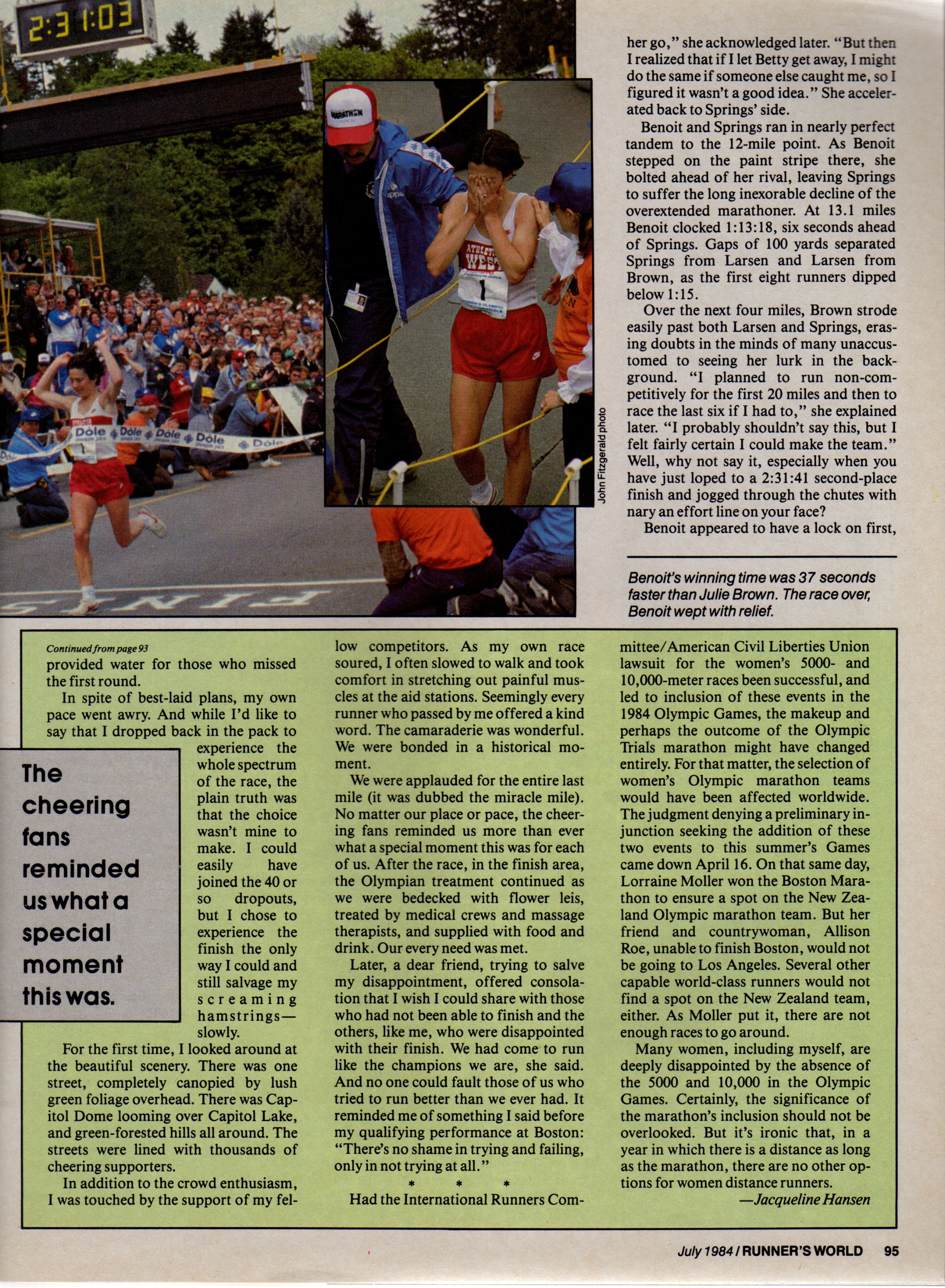 The judgement denying a preliminary injunction seeking the addition of these two events to the summer’s Games in 1984 came down April 16, 1984. On that same day, Lorraine Moller won the Boston Marathon to ensure a spot on the New Zealand Olympic marathon team. But her friend and countrywoman, Allison Roe, unable to finish Boston, would not be going to Los Angeles. Several other capable world-class runners would not find a spot on the New Zealand team either. As Moller put it, there are not enough races to go around.